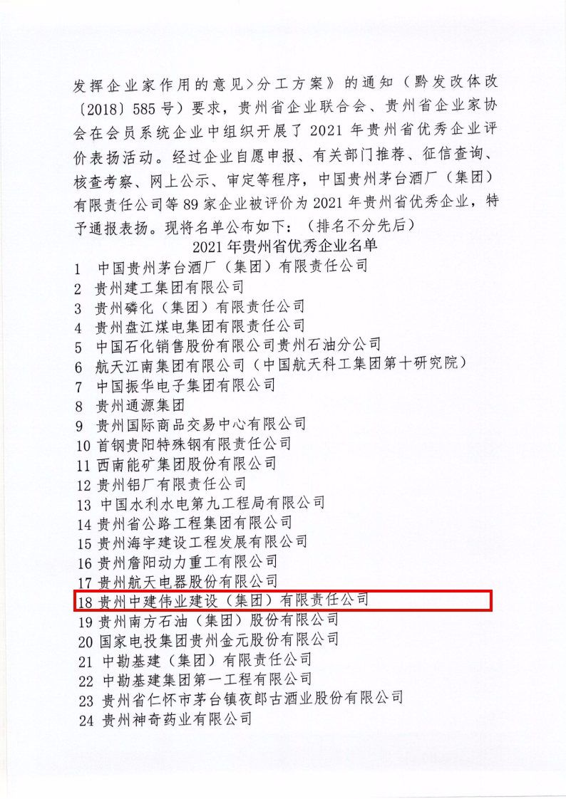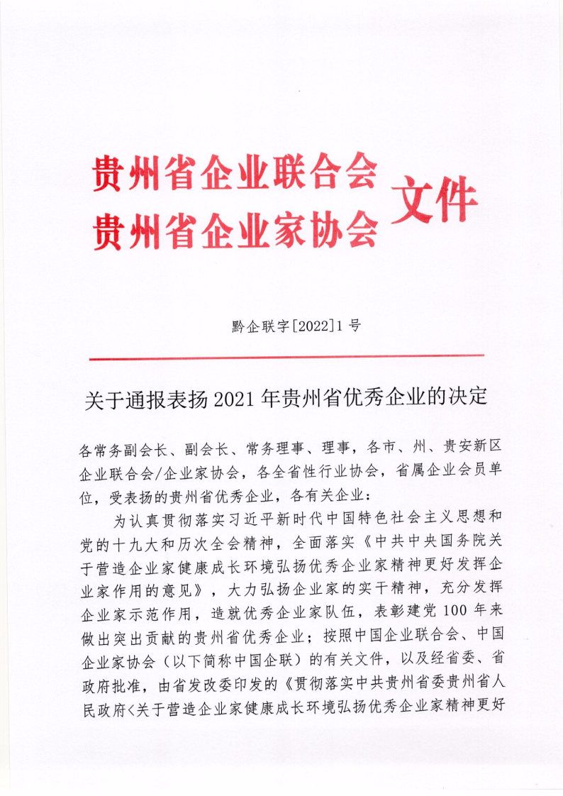 2022年1月10日,貴州省企業(yè)聯(lián)合會、貴州省企業(yè)家協(xié)會印發(fā)《關(guān)于通報(bào)表揚(yáng)2021年貴州省優(yōu)秀企業(yè)的決定》,集團(tuán)公司被授予“貴州省優(yōu)秀企業(yè)”榮譽(yù)稱號。
